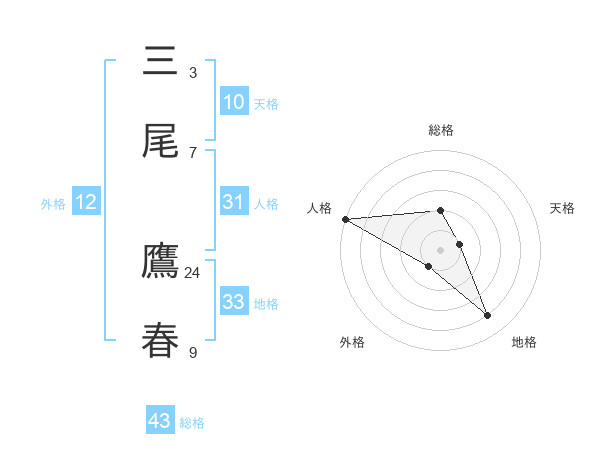 三尾 鷹春さんの総格は43画の2点