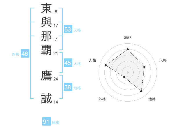 東與那覇 鷹誠さんの総格は91画の4点!