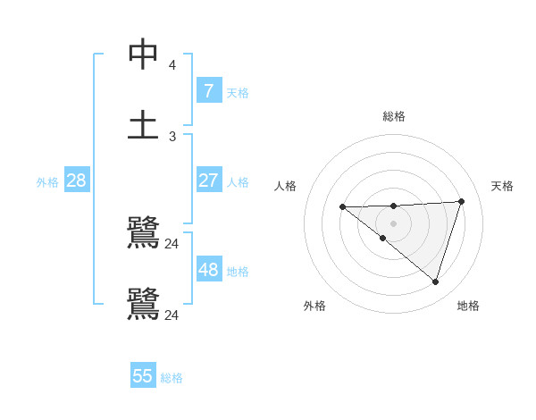 中土 鷺鷺さんの総格は55画の1点!