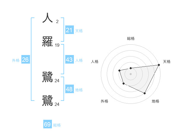 人羅 鷺鷺さんの総格は69画の1点!