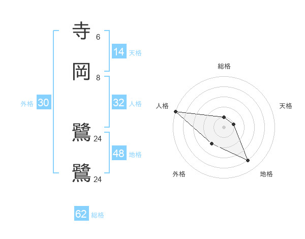 寺岡 鷺鷺さんの総格は62画の1点!