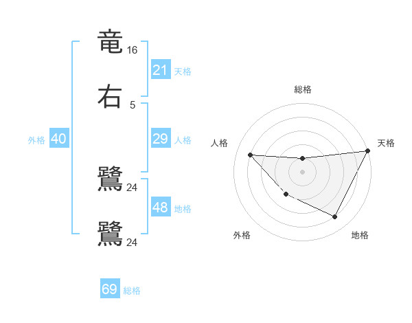 竜右 鷺鷺さんの総格は69画の1点!