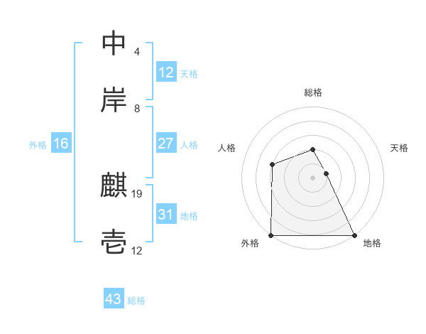 中岸 麒壱さんの総格は43画の2点!