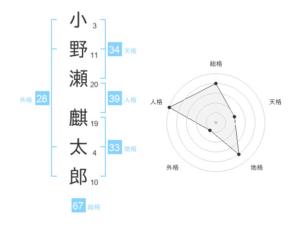小野瀬 麒太郎さんの総格は67画の4点!