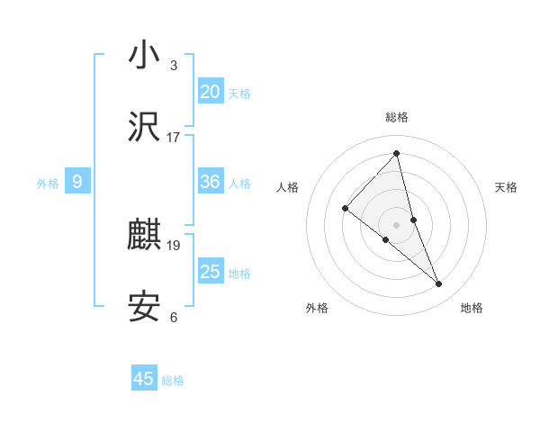 小沢 麒安さんの総格は45画の4点!