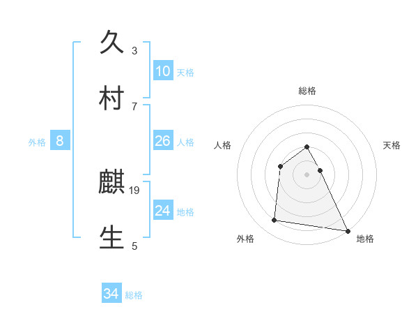 久村 麒生さんの総格は34画の2点!