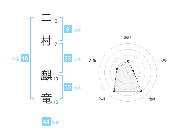 二村 麒竜さんの総格は44画の2点!