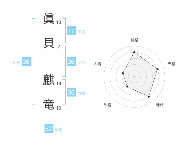 眞貝 麒竜さんの総格は52画の4点!