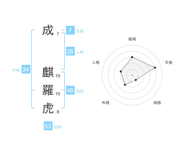 成 麒羅虎さんの総格は53画の3点!