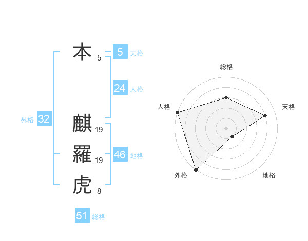 本 麒羅虎さんを姓名の画数から五運を鑑定