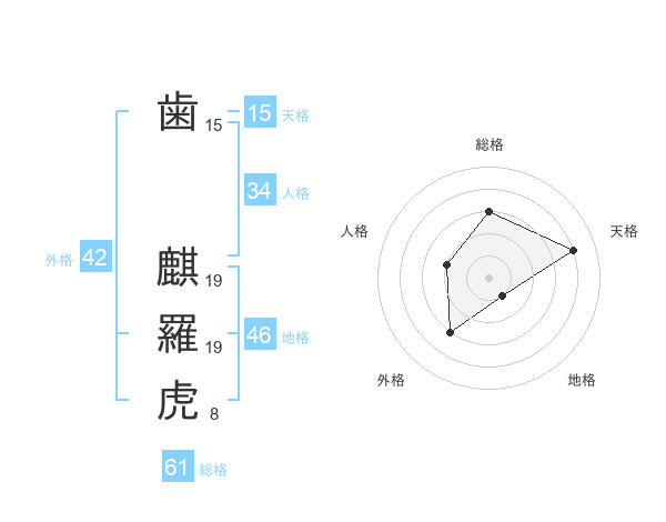 歯 麒羅虎さんの総格は61画の3点!