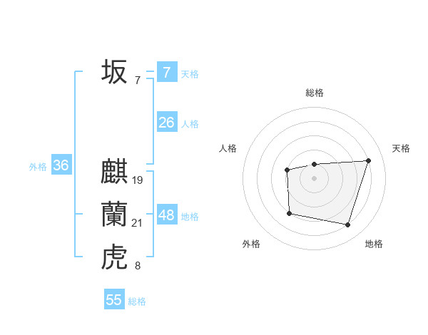 坂 麒蘭虎さんの総格は55画の1点!