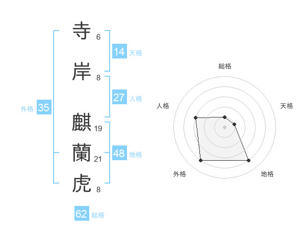 寺岸 麒蘭虎さんの総格は62画の1点!