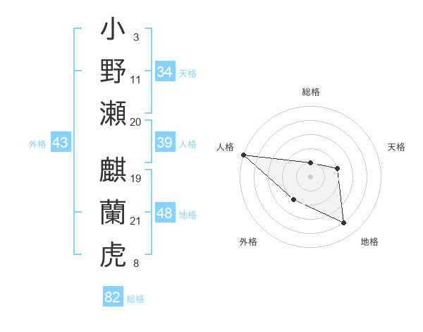 小野瀬 麒蘭虎さんの総格は82画の1点!