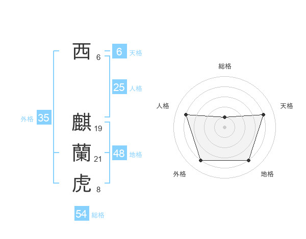 西 麒蘭虎さんの総格は54画の1点!