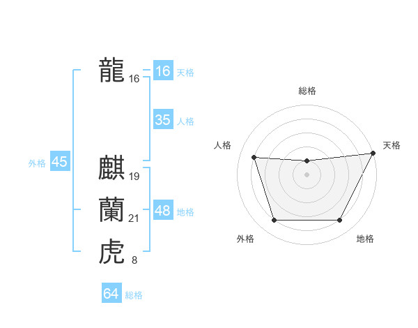 龍 麒蘭虎さんの総格は64画の1点!