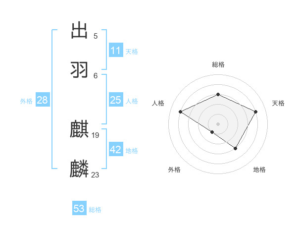出羽 麒麟さんを姓名の画数から五運を鑑定