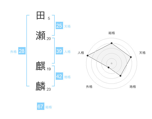 田瀬 麒麟さんの総格は67画の4点!