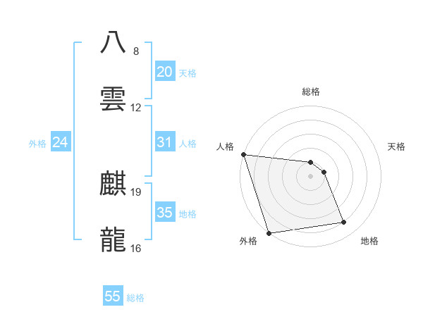 八雲 麒龍さんの総格は55画の1点!