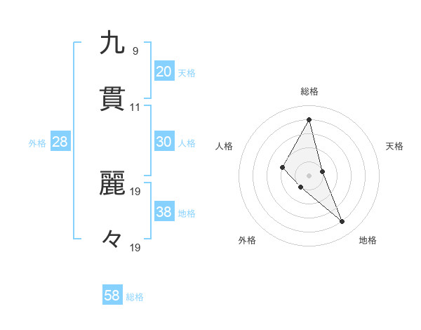 九貫 麗々さんを姓名の画数から五運を鑑定