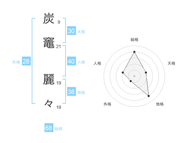炭竈 麗々さんの総格は68画の4点!