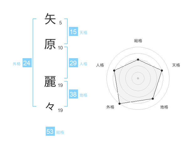 矢原 麗々さんの総格は53画の3点!