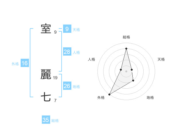 室 麗七さんの総格は35画の4点!