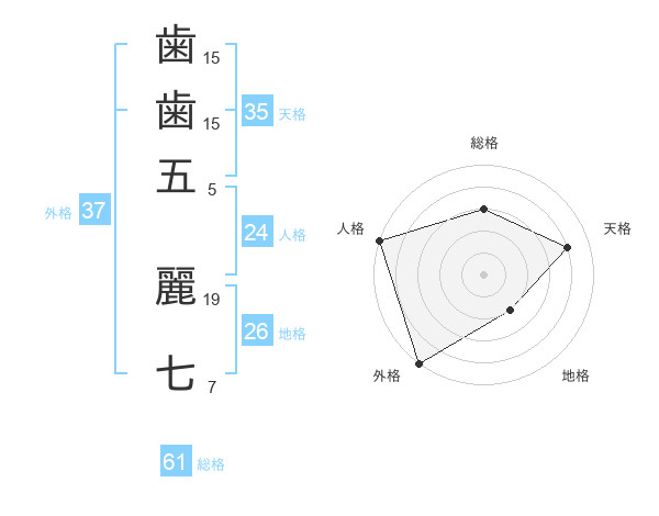 歯歯五 麗七さんの外格は37画の5点!