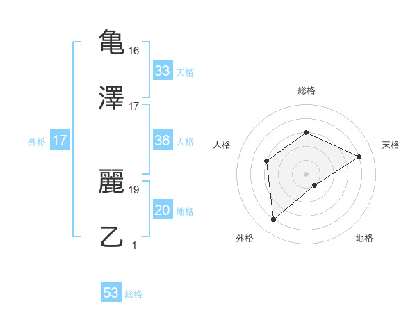 亀澤 麗乙さんの総格は53画の3点!