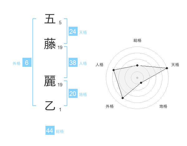 五藤 麗乙さんの総格は44画の2点!