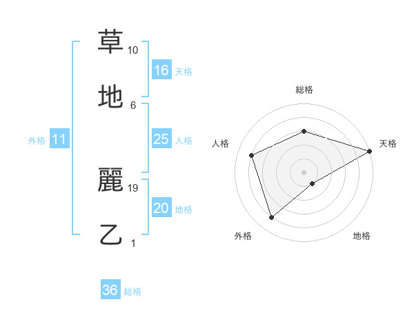 草地 麗乙さんの天格は16画の5点!