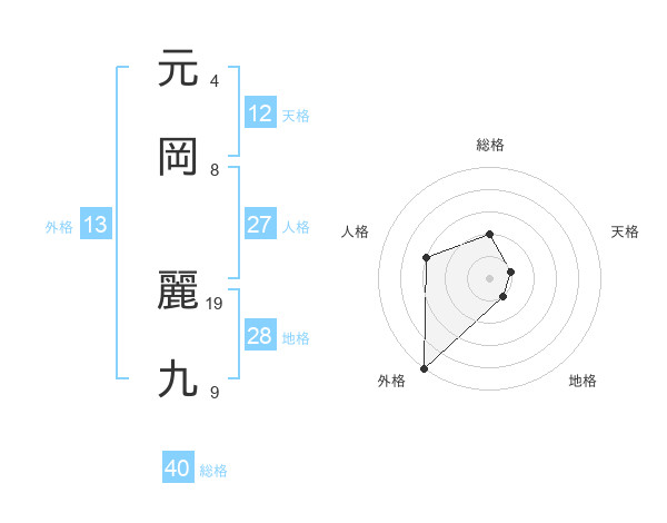 元岡 麗九さんを姓名の画数から五運を鑑定