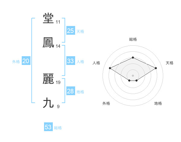 堂鳳 麗九さんの総格は53画の3点!
