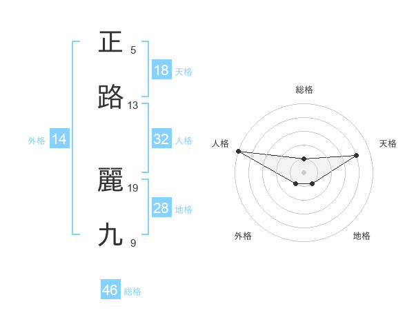 正路 麗九さんの総格は46画の1点!