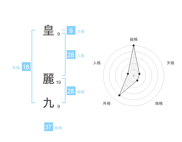 皇 麗九さんの総格は37画の5点!