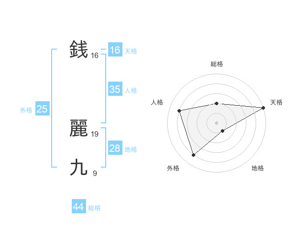 銭 麗九さんの総格は44画の2点!