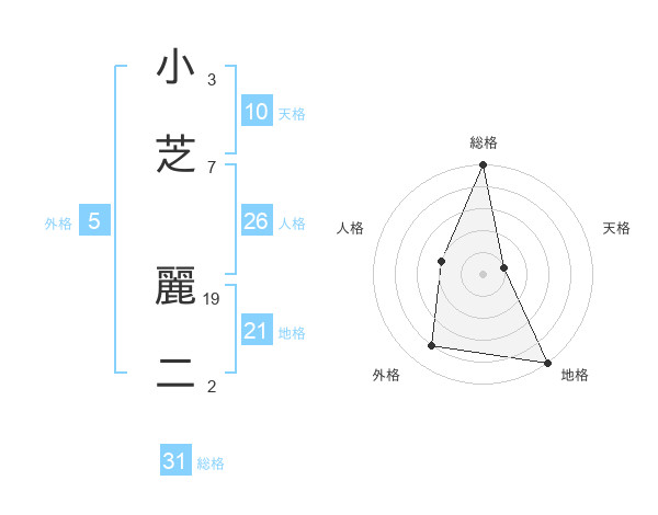 小芝 麗二さんの総格は31画の5点!