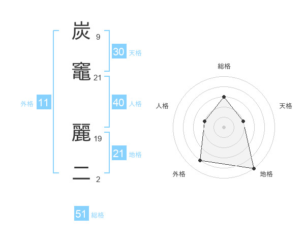 炭竈 麗二さんを姓名の画数から五運を鑑定