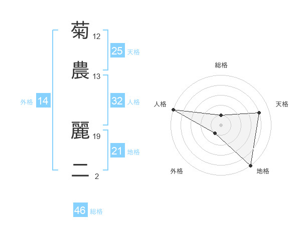 菊農 麗二さんの総格は46画の1点!