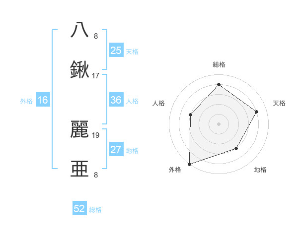 八鍬 麗亜さんの総格は52画の4点!