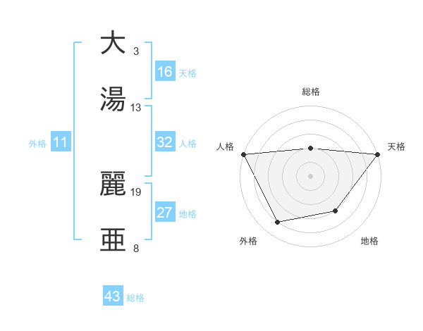 大湯 麗亜さんを姓名の画数から五運を鑑定