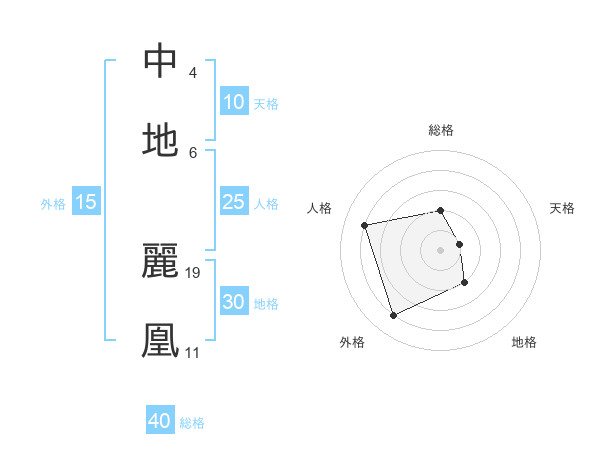 中地 麗凰さんの総格は40画の2点!