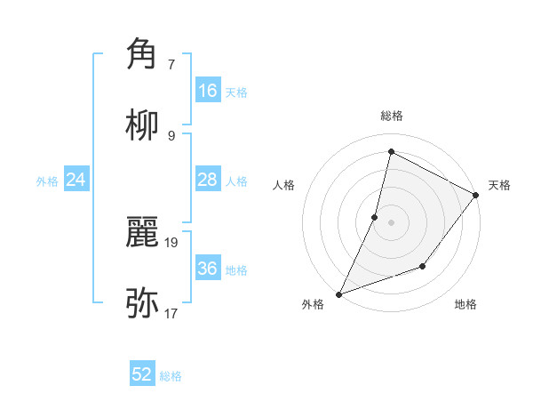 角柳 麗弥さんの総格は52画の4点!