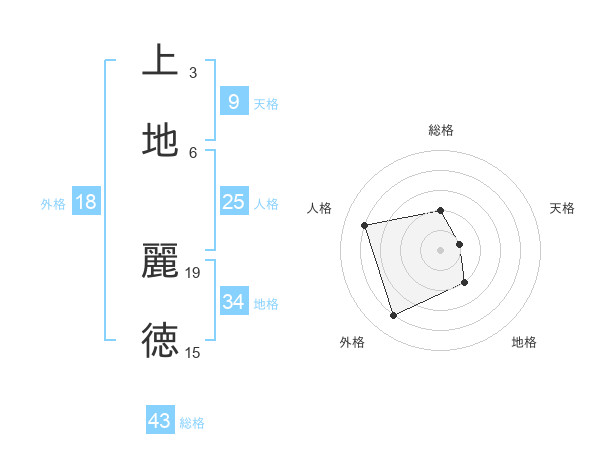 上地 麗徳さんの総格は43画の2点!