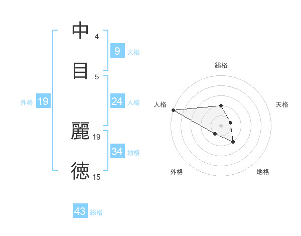 中目 麗徳さんの総格は43画の2点!
