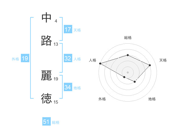 中路 麗徳さんの天格は17画の4点!