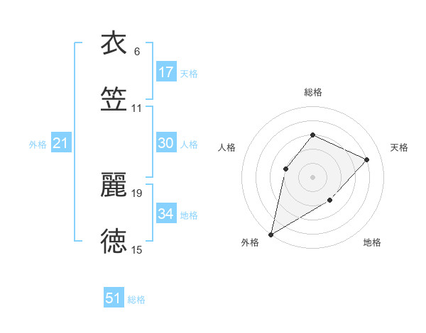 衣笠 麗徳さんを姓名の画数から五運を鑑定