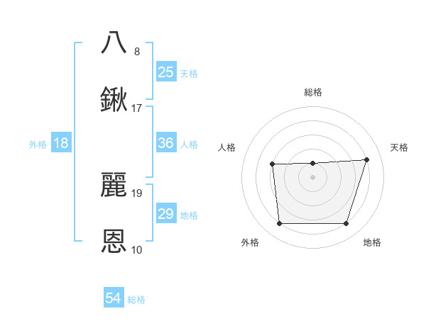 八鍬 麗恩さんの天格は25画の4点!