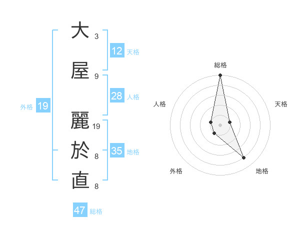 大屋 麗於直さんを姓名の画数から五運を鑑定
