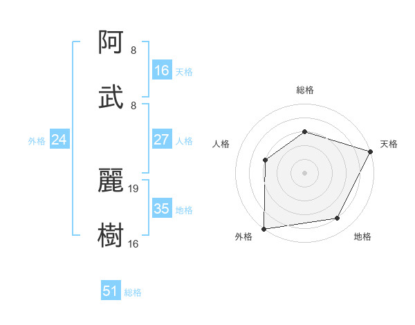 阿武 麗樹さんを姓名の画数から五運を鑑定